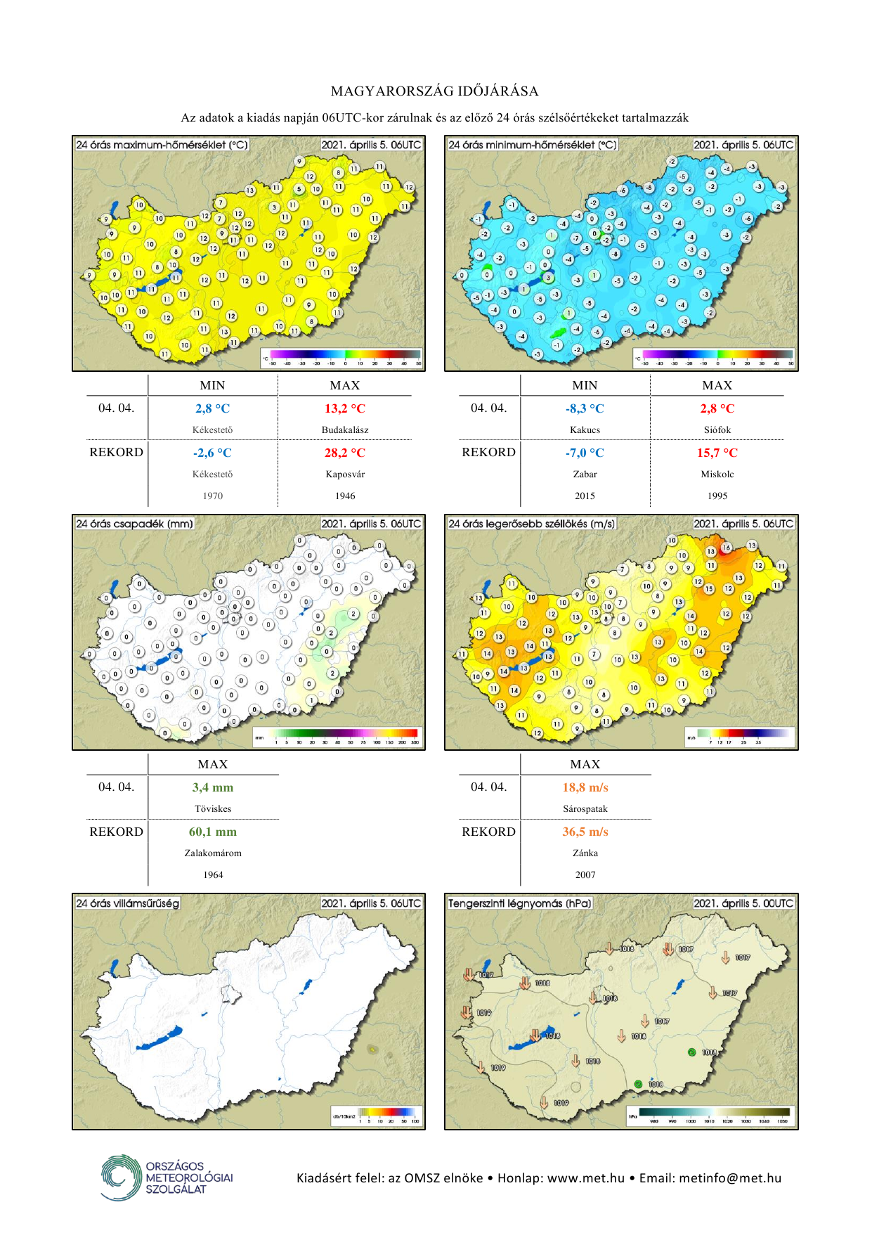 Az 1-i Tmin : -4,3 fok, Tmax : 8,6 fok, a 2-i Tmin : -6,7 fok, Tmax : 8 fok, a 3-i Tmin : -6,2 fok, Tmax : 8 fok, a 4-i Tmin : -2,7 fok, Tmax : 5,4 fok, a mai Tmin : -2,2 fok, Tmax : 5,6 fok volt.