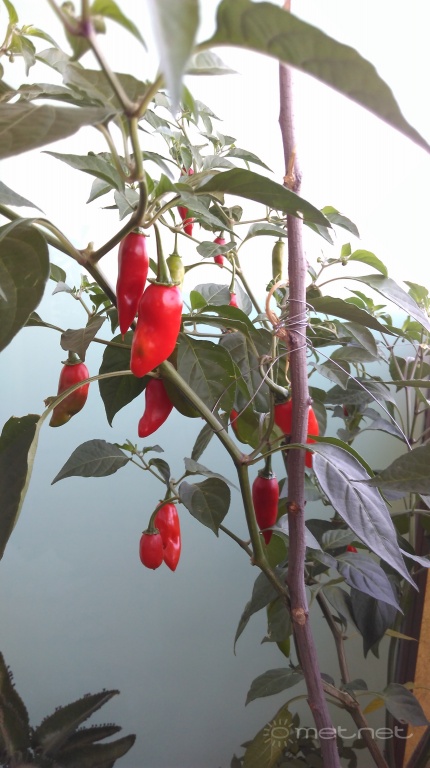 A képen látható paprikák magjai két éve (2017 januárban) lettek elültetve, majd palántázva. Nyáron üvegházban volt, és szépen termett. Télen a szoba ablakban volt teleltetve, majd idén tavasszal ki lett téve az üvegházba, ott hozta ismét a terméseit. A fénykép ma készült, és ismét megpróbálom az ablakban teletetni. Kíváncsi vagyok, ismét áttelel-e?