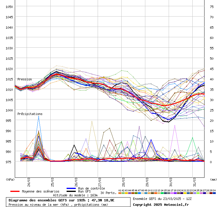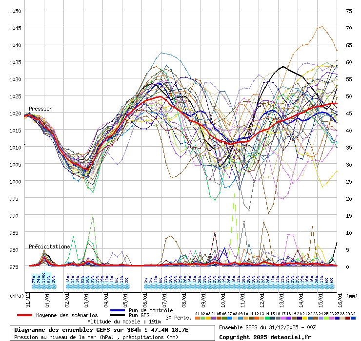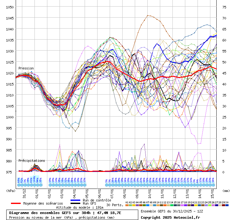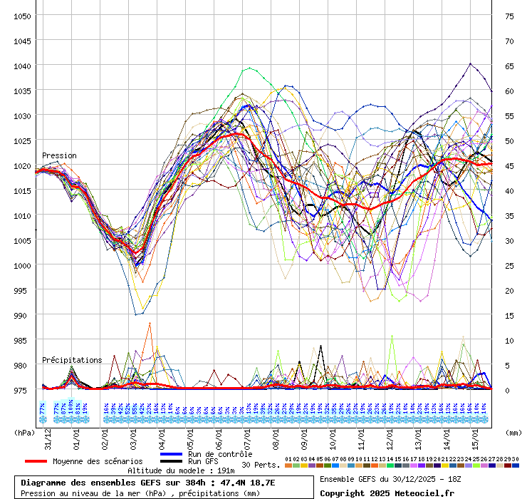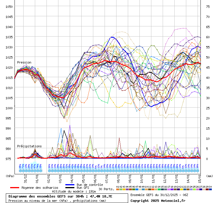 Közös jellemzõk: 980-1005 hPa körül a legmélyebb légnyomás, csak más és más idõpontban! Ha itt a tagokat külön-külön ki lehetne emelni ( Link ) akkor látszódna is, hogy nagyon sok tag kacsint a mélybe, nem a fõfutás az elrugaszkodott, hanem jó kétharmaduk, csak attól függ, melyik vonalat vastagítjuk ki. Van egy 5-6 tag, ami 1020 alá nem viszi a nyomást (sõt, ezek közül 1-2 tag 1030 alá sem!), szóval tényleg lehet, hogy kitart a hidegpárna (ha a szél is el tud maradni), csak nem ennek van jelenleg esélye! Ezért megtévesztõ kijelenteni, hogy januárig marad a hidegpárna. Most az a valószínû a GFS fõfutás és ENS alapján, hogy jelentõsen beenyhül az idõjárás. Ez még változhat, természetesen bármerre.
