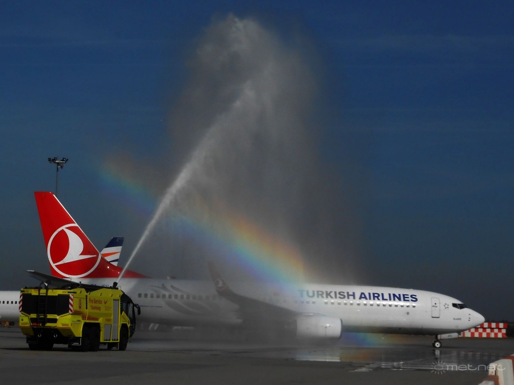Egy tegnapi üdvözlő locsolás a reptérről mesterséges szivárvánnyal: Link