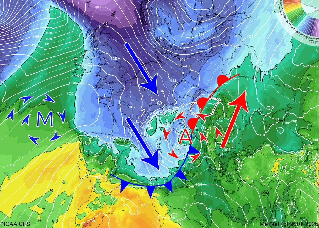 Európa időjárását egy Skandináv-félsziget felett örvénylő ciklon és az Atlanti-óceán felett elhelyezkedő anticiklon határozza meg. A két képződmény közös áramlási rendszerében, a ciklon hidegfrontja mögött sarkvidéki eredetű levegő zúdul Európa nyugati felére. A hidegfront az Alpokhoz érve lelassul, hullámot vet és kialakul egy mediterrán ciklon, ami napokig hazánk felett fog örvényleni.