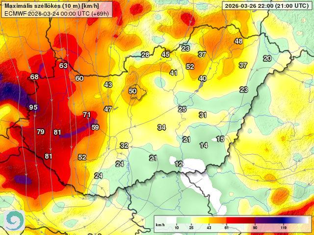 Széllökések csütörtök késő este (ECMWF-Hungaromet)