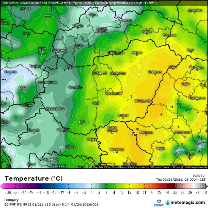Hőmérséklet csütörtök délután (ECMWF-modell)