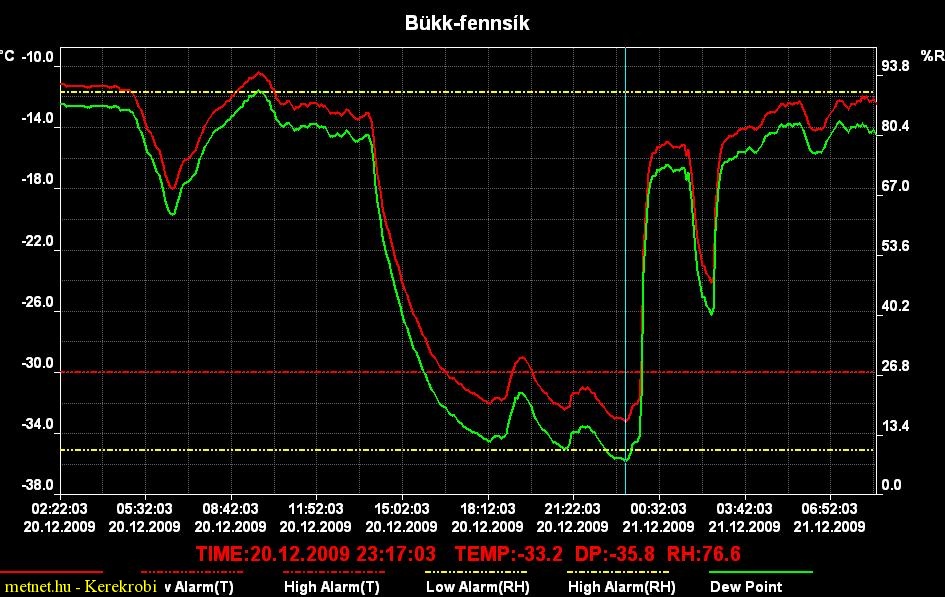| Leírás: Bükk-fennsík fagyzug mérés. 2009.12.20. Tmin:-33,2 fok. Tmax: -10,4 fok. Napi közép: -18,7 fok volt. |