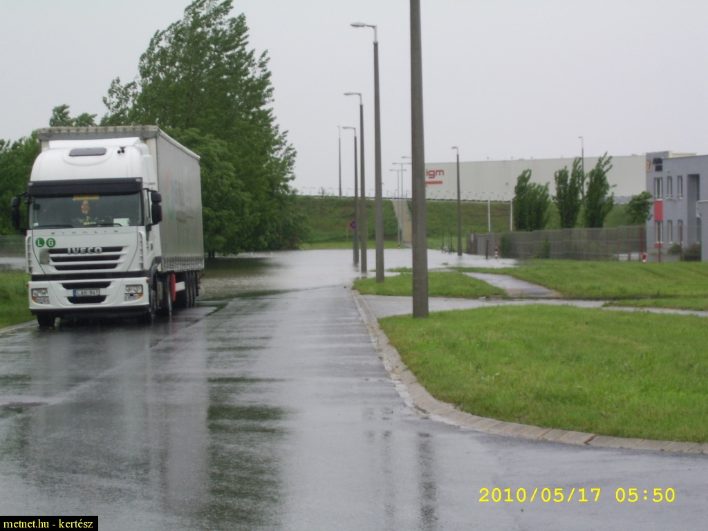 | Leírás: A kiöntött csapadékvíztározó tó járhatatlanná tette a melette lévõ út egy részét | |