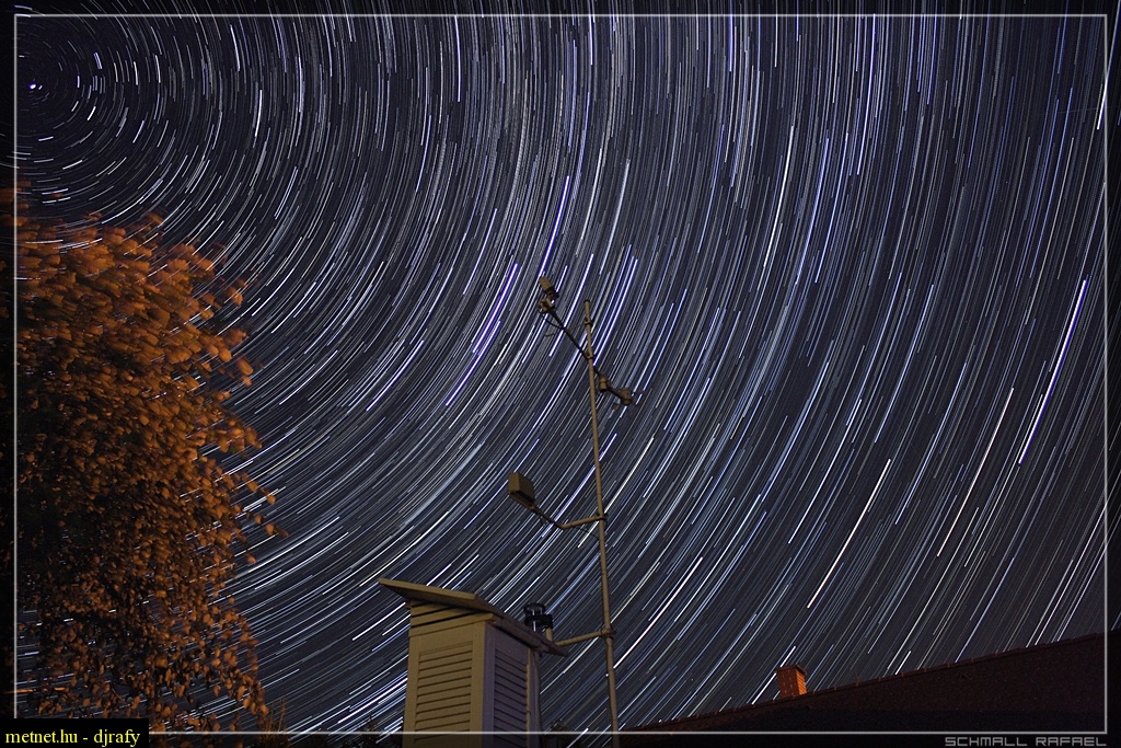 | Leírás: Csíkhúzós felvétel. 88 darab képbõl készült! Egy kép: ISO1600, f3.5, 30sec exp. A kép elõterében a hõmérõházikó látható! | |
