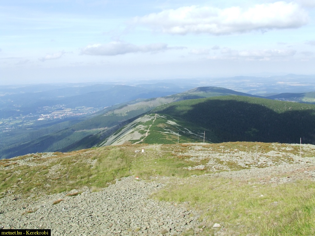 | Leírás: Kilátás Csehország legmagasabb pontjáról; az 1602 m magas Snezka-csúcsról. A hegycsúcs az Óriáshegységben található; felvonóval; egy középsõ 1300 m körüli szintes átszállással is megközelíthetõ Pec pod Snezkou település felõl. | |