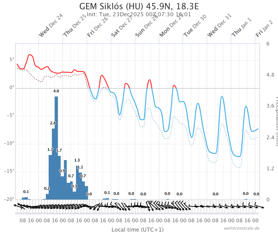Hétfőn este melegfront érkezik, ami főként északra és keletre hoz csapadékot, zömében havat, de előfordul majd vegyes halmazállapotú csapadék is.