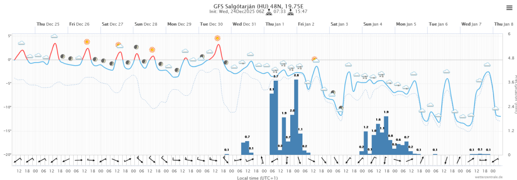 Hétfőn este melegfront érkezik, ami főként északra és keletre hoz csapadékot, zömében havat, de előfordul majd vegyes halmazállapotú csapadék is.