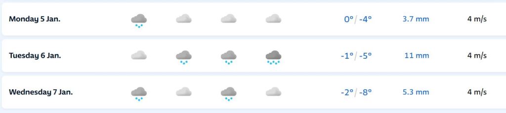 Hétfőn este melegfront érkezik, ami főként északra és keletre hoz csapadékot, zömében havat, de előfordul majd vegyes halmazállapotú csapadék is.