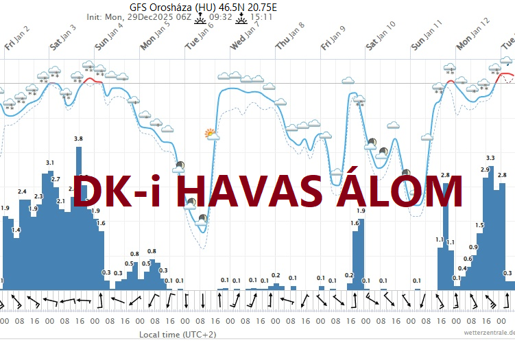 Hétfőn este melegfront érkezik, ami főként északra és keletre hoz csapadékot, zömében havat, de előfordul majd vegyes halmazállapotú csapadék is.