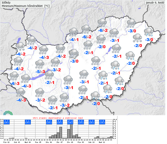 Hétfőn este melegfront érkezik, ami főként északra és keletre hoz csapadékot, zömében havat, de előfordul majd vegyes halmazállapotú csapadék is.