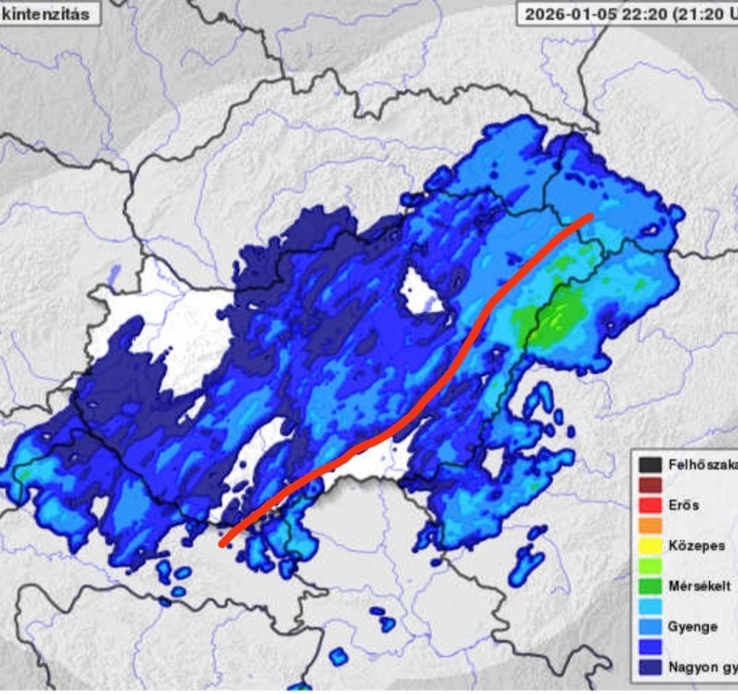 Hétfőn este melegfront érkezik, ami főként északra és keletre hoz csapadékot, zömében havat, de előfordul majd vegyes halmazállapotú csapadék is.