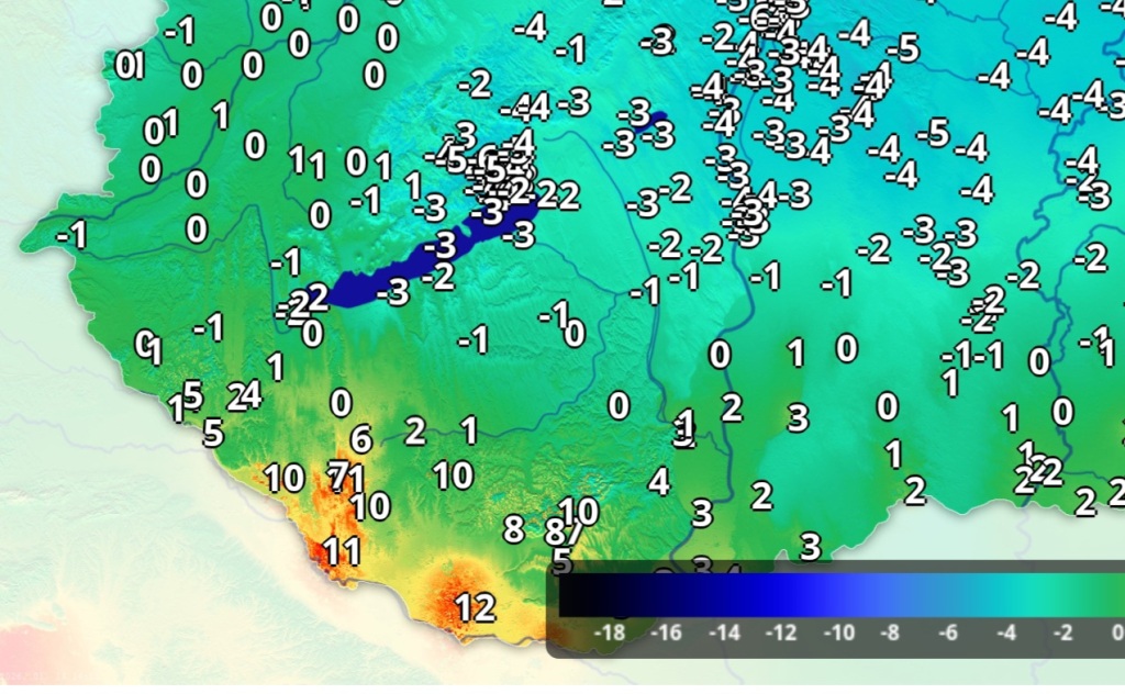 Hétfőn este melegfront érkezik, ami főként északra és keletre hoz csapadékot, zömében havat, de előfordul majd vegyes halmazállapotú csapadék is.