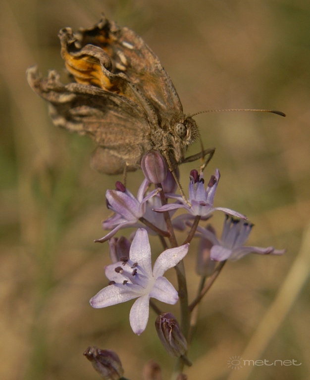 | Leírás: Õszi csillagvirág egy, a bábból frissen kibújt, még nedves és gyûrött, valamilyen szemeslepkével. Csinos páros! | |