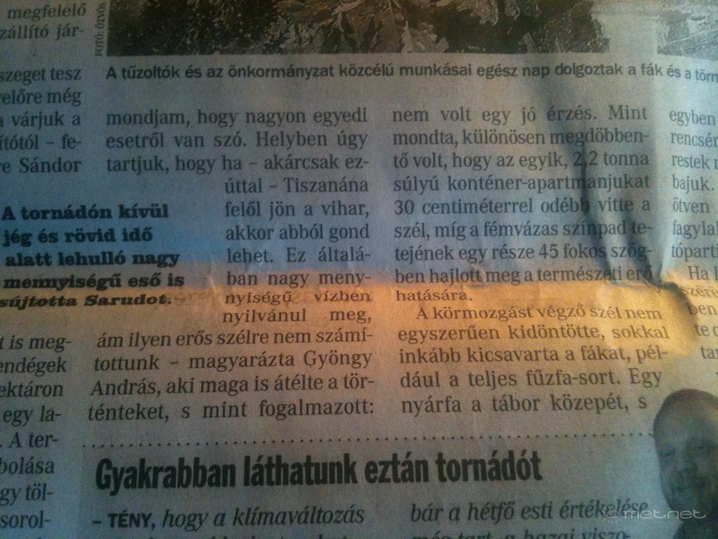 Leírás: Cikkdokumentáció a sarudi tornádóról. Forrás: Heves Megyei Hírlap. Felhasználás célja: tudományos dokumentációs cél