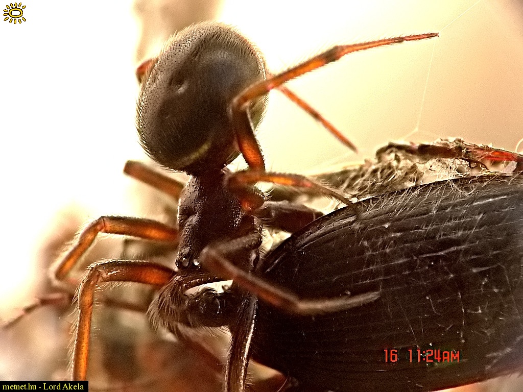 Leírás: Az áldozat kétszer nagyobb mint a süvölvény pók. Elcsitult a küzdelem, a pók teszi a dolgát. EXIF F8,0 ISO64 1/600 (Sony F828 3264p telézés+digizoom makro módban)