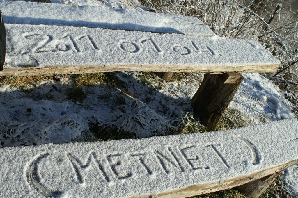 | Leírás: A 10 éves Metnet neve hóba vésve a részleges napfogyi alkalmából a szélrekordokat döntögetõ Kab-hegy tetején :-) | |