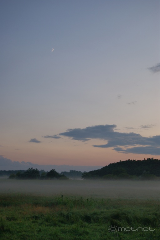 Leírás: Júliusi sekély köd és a Hold sarlója a mocsár felett