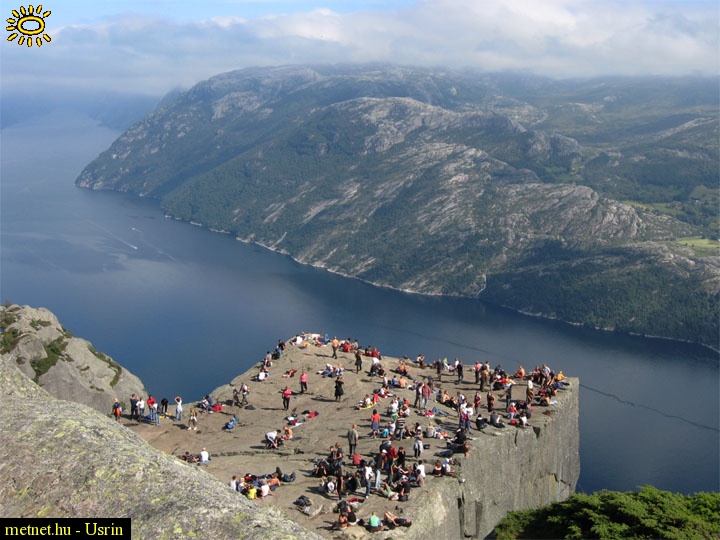 | Leírás: A Preikestolen sziklája 602 méteres függõleges fallal magasodik a fjord fölé | |
