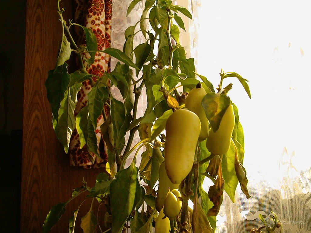 Leírás: Novemberi paprika virágzott,utóérésû paradicsom a szobában három hét elteltével is.