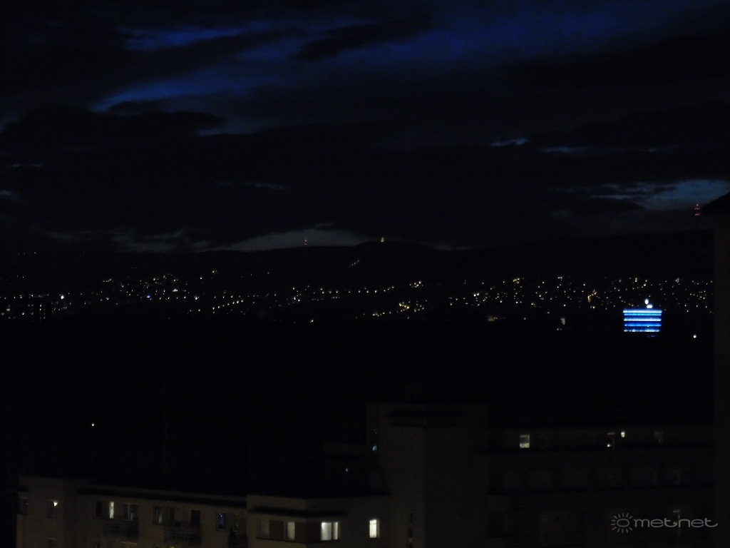 Leírás: Félhomályban,távolban az Erzsébet kilátó a János hegyen,elõtérben a Tunsgram épülete.