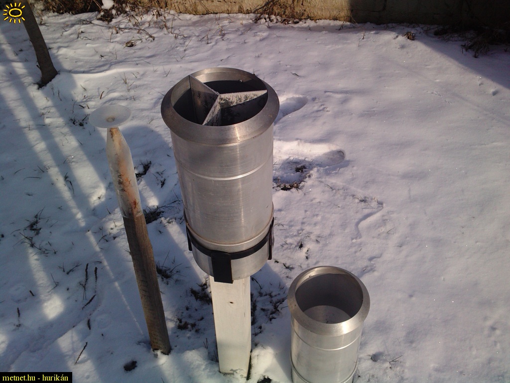 | Leírás: Hellmann csapadékmérõm, benne a hófogó ráccsal. Valamint a pót mérõ, folyamatos havazás esetére, amikor be kell vinni kiolvasztani reggel a másikat. | |