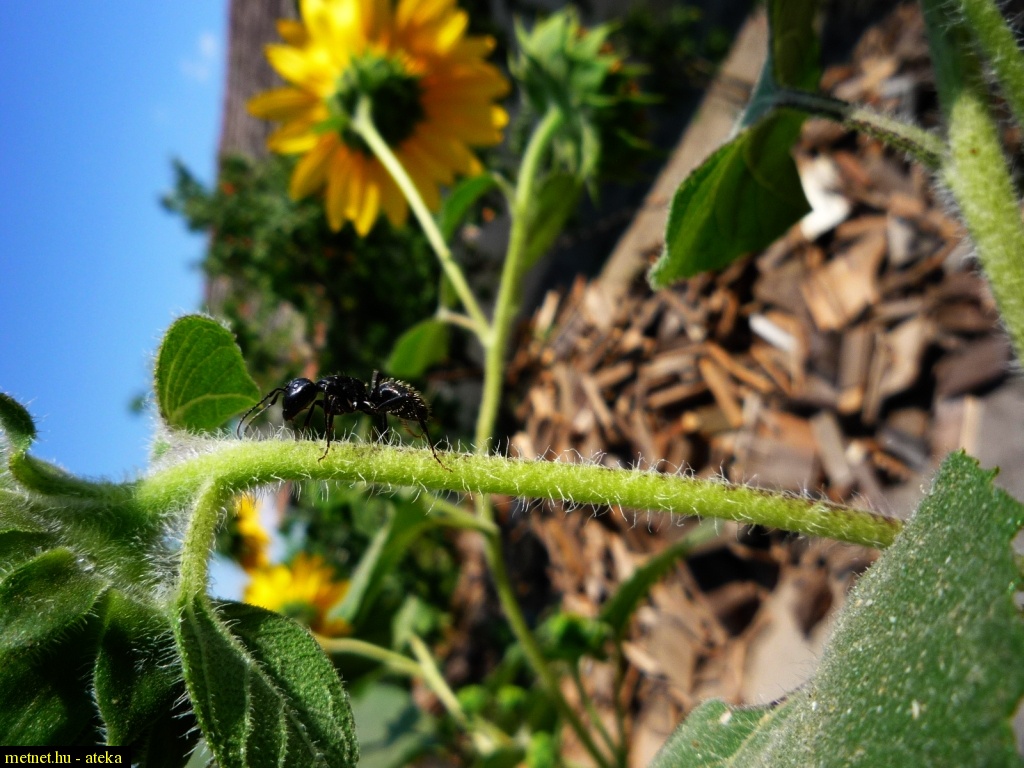 Leírás: Óriáshangya a napraforgó ágán.
