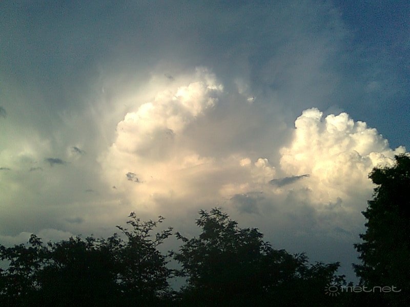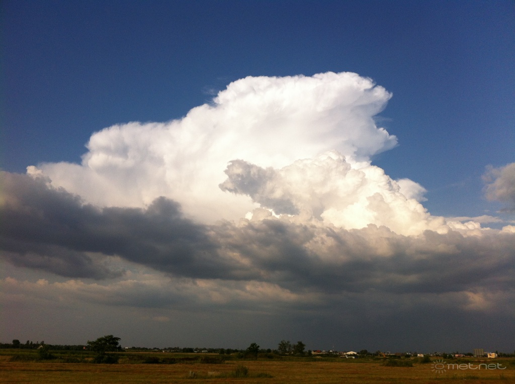 Délel?tt az ország északi részén már szórványosan el?fordultak zivatarok, károkozó eseményr?l azonban eddig nem érkezett jelentés. Ámbár az elmúlt órában Miskolc térségében egy er?s zivatargóc haladt át, mely már okozhatott jéges?t vagy felh?szakadást. Jelenleg az Alföld középs? részén figyelhet? meg a legintenzívebb gomolyfelh?-képz?dés, és egyre több zápor, zivatar alakul ki a térségben. Dom fotója a nemrég Miskolc közelében elhaladt zivatarról: